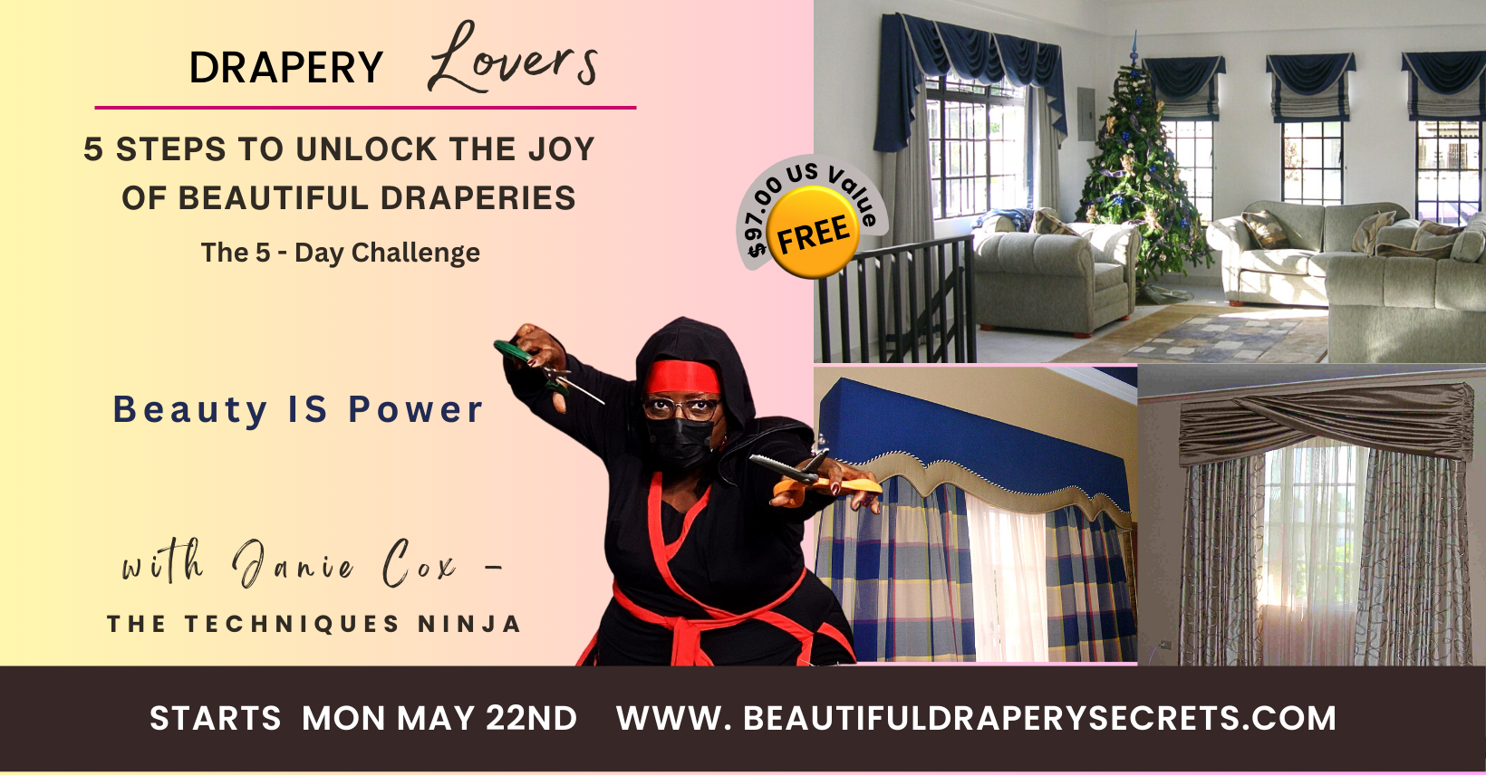 Starting Monday 22nd May, we'll go live for 60 minutes for 5 consecutive days in our private Facebook group. Experience the joy of being in a virtual room of Beautiful Draperies. Learn how to select the correct window treatment to suit your décor and be inspired to create your own oasis. Plus discover how key principles and expert techniques can improve your quality of life and position you to succeed.